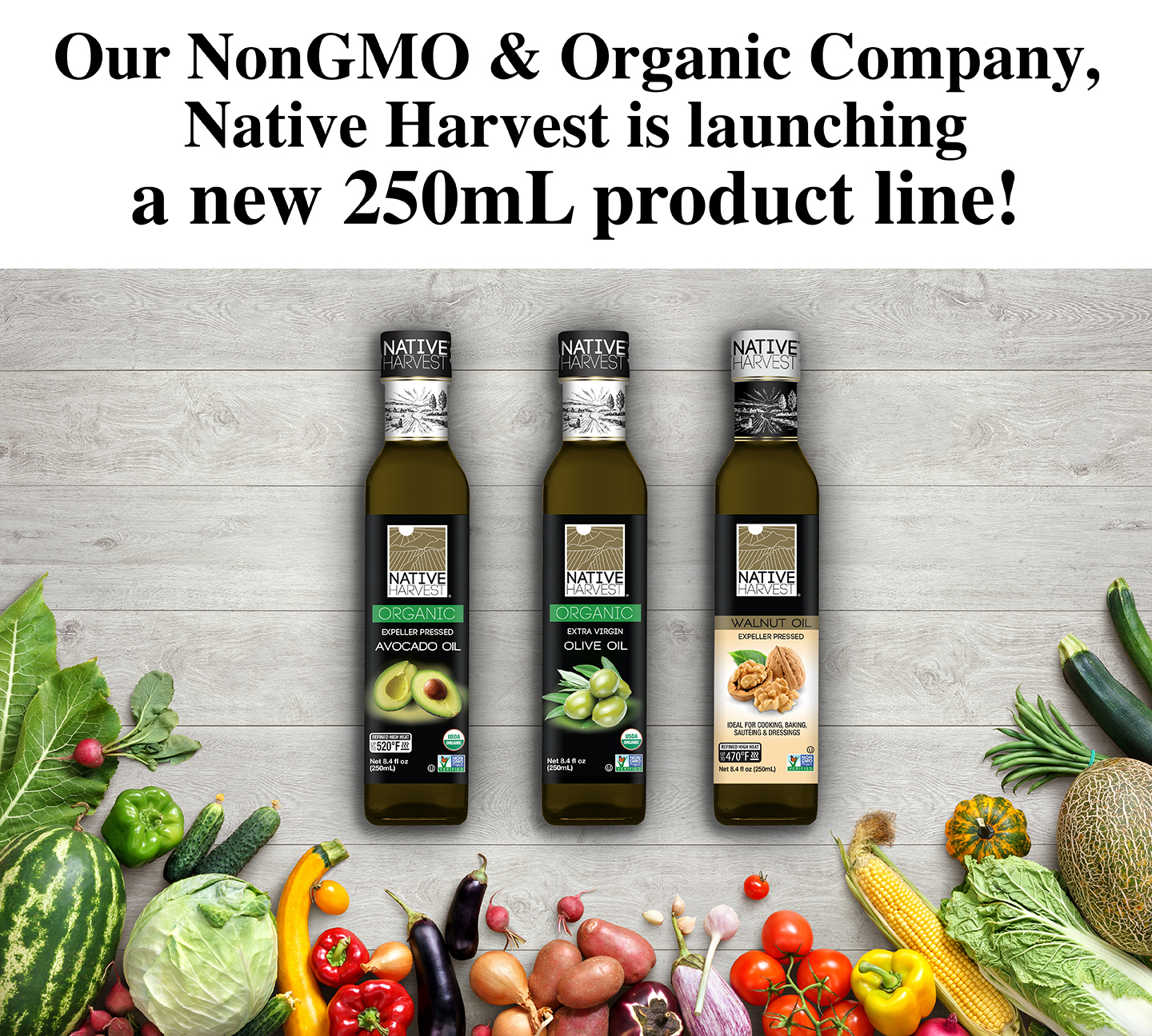 American Vegetable Oils provides high quality products for retail and the food service industry. Our NonGMO and Organic products company, Native Harvest is launching a new product line that comes in a 250mL square shaped glass bottle, that is convenient for small families and individuals alike.